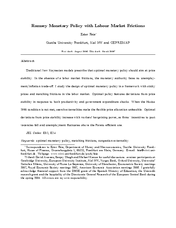 stability. In the absence of a labor market frictions, the monetary authority faces no unemployment/inflation trade-off. I study the design of optimal monetary policy in a framework with sticky prices and matching frictions in the labor market. Optimal policy features deviations from price stability in response to both productivity and government expenditure shocks. When the Hosios 1990 condition is not met, search externalities make the flexible price allocation unfeasible. Optimal deviations from price stability increase with workers’ bargaining power, as firms´ incentives to post vacancies fall and unemployment fluctuates above the Pareto efficient one.