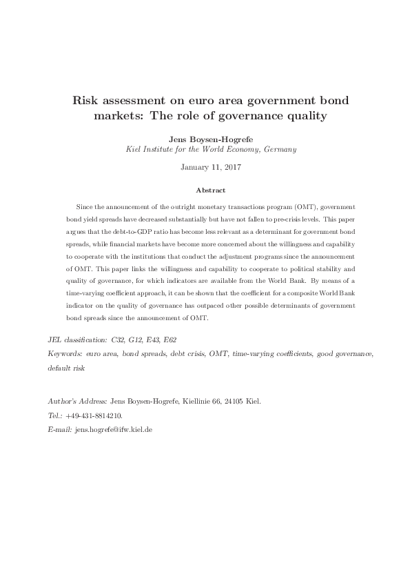Since the announcement of the outright monetary transactions program (OMT), government bond yield spreads have decreased substantially but have not fallen to pre-crisis levels. This paper argues that the debt-to-GDP ratio has become less relevant as a determinant for government bond spreads, while financial markets have become more concerned about the willingness and capability to cooperate with the institutions that conduct the adjustment programs since the announcement of OMT. This paper links the willingness and capability to cooperate to political stability and quality of governance, for which indicators are available from the World Bank. By means of a time-varying coefficient approach, it can be shown that the coefficient for a composite World Bank indicator on the quality of governance has outpaced other possible determinants of government bond spreads since the announcement of OMT.
