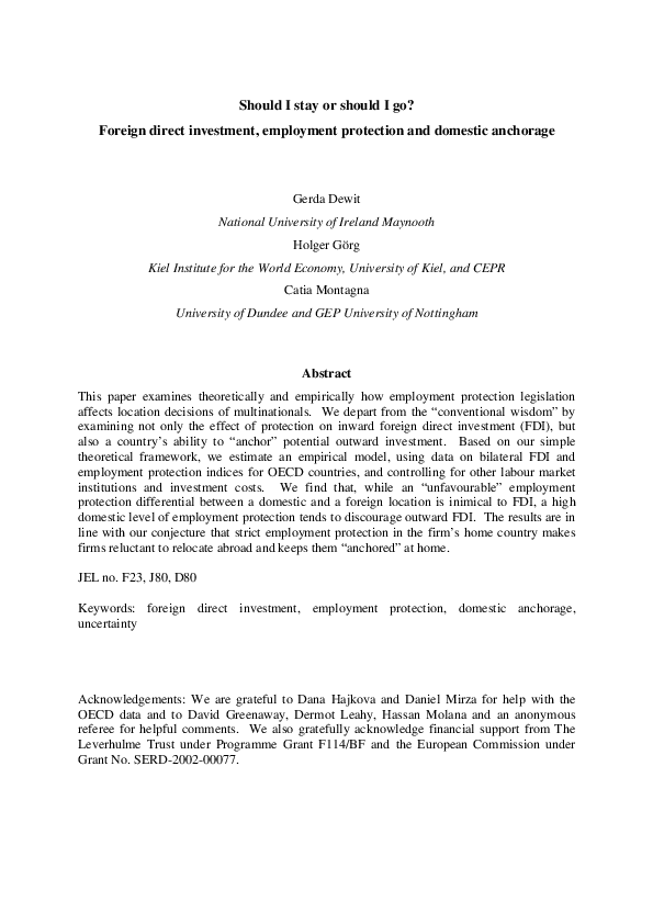 This paper examines theoretically and empirically how employment protection legislation affects location decisions of multinationals. We depart from the “conventional wisdom” by examining not only the effect of protection on inward foreign direct investment (FDI), but also a country’s ability to “anchor” potential outward investment. Based on our simple theoretical framework, we estimate an empirical model, using data on bilateral FDI and employment protection indices for OECD countries, and controlling for other labour market institutions and investment costs. We find that, while an “unfavourable” employment protection differential between a domestic and a foreign location is inimical to FDI, a high domestic level of employment protection tends to discourage outward FDI. The results are in line with our conjecture that strict employment protection in the firm’s home country makes firms reluctant to relocate abroad and keeps them “anchored” at home.