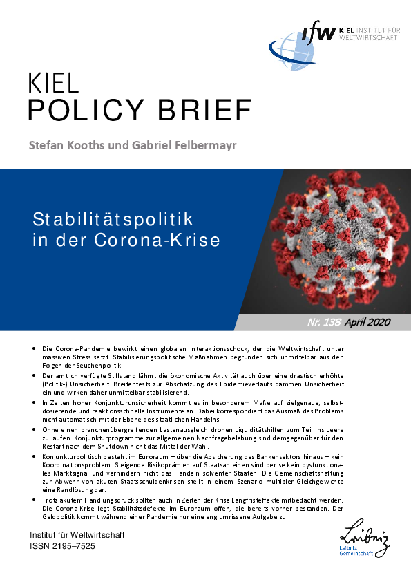 The corona pandemic causes a global interaction shock that puts the world economy under massive stress. Stabilization policy measures are directly justified by the consequences of the epidemic policy. The authors emphasize that in times of high economic uncertainty, it is particularly important to have precisely targeted, self-dosing and fast-reacting instruments. They consider a cross-sectoral burden sharing as necessary to ensure that liquidity support is effective. By contrast, economic stimulus packages to boost demand in general are not the means of choice for the restart after the shutdown. At the European Community level, safeguarding the banking sector is the best justifiable contribution to stabilization. According to the authors, rising risk premiums on government bonds are not per se a dysfunctional market signal and do not prevent solvent states from acting. In their view, joint liability to avert acute sovereign debt crises is only a marginal solution in a scenario of multiple equilibria. They recommend that, despite acute pressure to act, long-term effects should also be considered in times of crisis. This is because the corona crisis reveals stability defects in the euro area that already existed before the crisis.