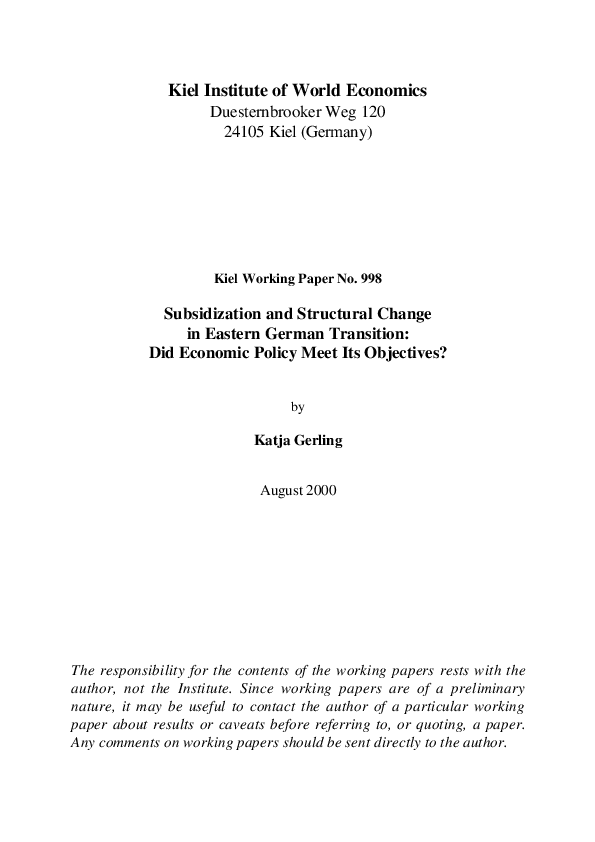 Subsidization and Structural Change in Eastern German Transition: Did Economic Policy Meet Its Objectives?