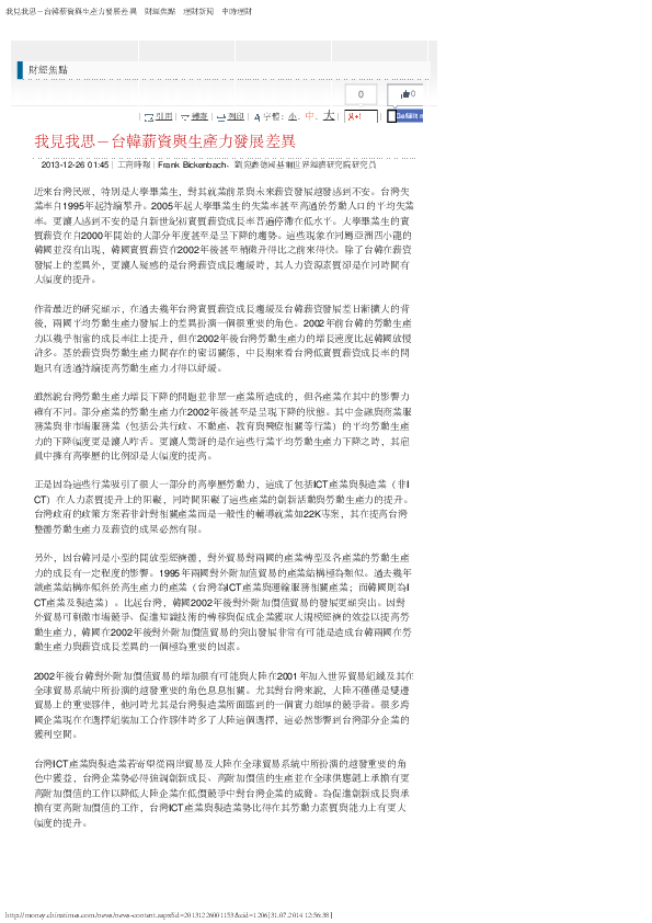 Taiwan versus Korea: Difference in Wage and Productivity Development (Chinese: Tai-Han xinzi yu shengchanli fazhan chayi)