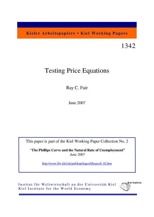 How inflation and unemployment are related in both the short run and long run is perhaps the key question in macroeconomics. This paper tests various price equations using quarterly U.S. data from 1952 to the present. Issues treated are the following. 1) Estimating price and wage equations in which wages affect prices and vice versa versus estimating "reduced form" price equations with no wage explanatory variables. 2) Estimating price equations in (log) level terms, rst difference (i.e., inflation) terms, and second difference (i.e., change in inflation) terms. 3) The treatment of expectations. 4) The choice and functional form of the demand variable. 5) The choice of the cost-shock variable. The results reject the use of rational expectations and suggest that the best speci cation is a price equation in level terms imbedded in a price-wage model, where the wage equation is also in level terms. The best cost-shock variable is the import price deflator, and the best demand variable is the unemployment rate. There is some evidence of a nonlinear effect of the unemployment rate on the price level at low values of the unemployment rate. Many of the results in this paper are contrary to common views in the literature, but the empirical support for them is strong.