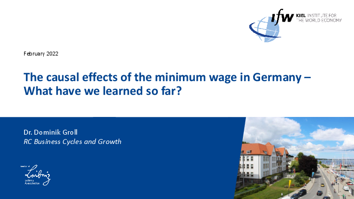 This presentation gives an overview of the empirical evidence on the causal effects of the minimum wage introduction on hourly wages, employment, working hours, poverty measures and more. It then discusses to what extent these findings can be carried over to the minimum wage hike to 12€ planned for this year.