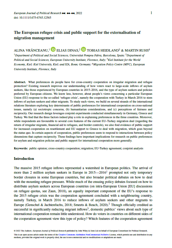 What preferences do people have for cross-country cooperation on irregular migration and refugee protection? While existing research improves our understanding of how voters react to large-scale inflows of asylum seekers, like those experienced by European countries in 2015–2016, and the type of asylum seekers and policies preferred by European citizens, we know less about people's views concerning a particular EU response to the so-called ‘refugee crisis’, namely the cooperation it agreed with Turkey in March 2016 to stem inflows of asylum seekers and other migrants. To study such views, we build on several strands of the international relations literature exploring key determinants of public preferences for international cooperation on cross-national issues, namely (a) sociotropic concerns, (b) humanitarian considerations, and (c) perceptions of fairness and reciprocity. Our research design leverages conjoint experiments conducted simultaneously in Germany, Greece, and Turkey. We find that the three factors play indeed a role in explaining preferences in the three countries. Moreover, while respondents are favorable to several core features of the current EU-Turkey migration deal (regarding the return of irregular migrants, financial aid to refugees, and border controls), we also find evidence of public support for increased cooperation on resettlement and EU support to Greece to deal with migration, which goes beyond the status quo. In certain aspects of cooperation, public preferences seem to respond to interactions between policy dimensions that capture reciprocity. These findings have important implications for research on public preferences for asylum and migration policies and public support for international cooperation more generally.