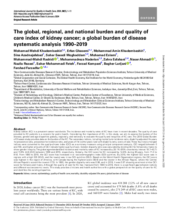 The global, regional, and national burden and quality of care index of kidney cancer; a global burden of disease systematic analysis 1990-2019