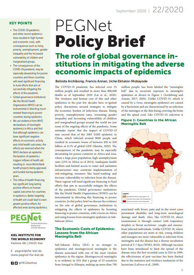 The COVID-19 pandemic has infected over 25 million people and resulted in more than 800,000 deaths as of September 2020. The virulence and human cost of this and other epidemics in the past few decades have re-ignited policy discussions around strategies to mitigate the economic burden of infectious disease. Rising poverty, unemployment rates, worsening gender inequality and increasing vulnerability of children and marginalized groups around the world are just some of the ongoing effects of the pandemic. This policy brief uses evidence from meningitis epidemics in Africa to show that although these shocks can have significant negative effects on economic activity and child health outcomes, global governance institutions like the WHO can play an important role in mitigating these effects.