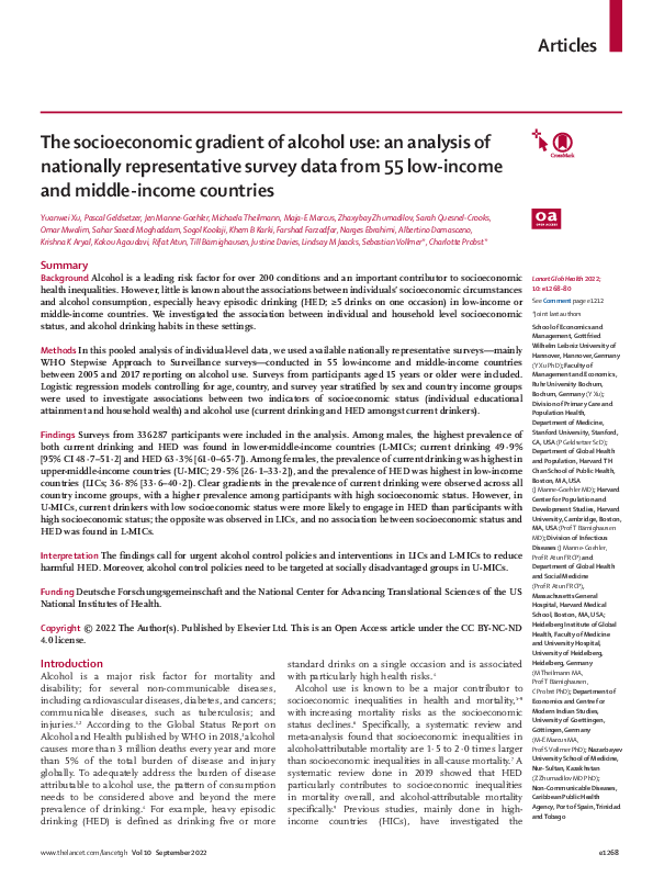 Interpretation: The findings call for urgent alcohol control policies and interventions in LICs and L-MICs to reduce harmful HED. Moreover, alcohol control policies need to be targeted at socially disadvantaged groups in U-MICs.