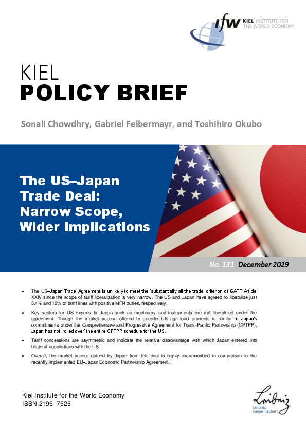 The authors analyze whether the US–Japan Trade Agreement is consistent with GATT Article XXIV that carves out an exception to the WTO’s ‘Most-Favored Nation’ (MFN) principle. They conclude that the agreement is unlikely to meet the ‘substantially all the trade’ criterion of GATT Article XXIV since the scope of tariff liberalization is very narrow. The US and Japan have agreed to liberalize just 3.4% and 10% of tariff lines with positive MFN duties, respectively. Key sectors for US exports to Japan such as machinery and instruments are not liberalized under the agreement. Though the market access offered to specific US agri-food products is similar to Japan’s commitments under the Comprehensive and Progressive Agreement for Trans-Pacific Partnership (CPTPP), Japan has not ‘rolled over’ the entire CPTPP schedule for the US. Tariff concessions are asymmetric and indicate the relative disadvantage with which Japan entered into bilateral negotiations with the US. Overall, the market access gained by Japan from this deal is highly circumscribed in comparison to the recently implemented EU–Japan Economic Partnership Agreement.