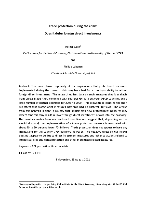 This paper looks empirically at the implications that protectionist measures implemented during the current crisis may have had for a country’s ability to attract foreign direct investment. The research utilizes data on such measures that is available from Global Trade Alert, combined with bilateral FDI data between OECD countries and a large number of partner countries for 2006 to 2009. This allows us to examine the short run effect that protectionist measures may have had on bilateral FDI flows. The verdict from this analysis is clear: a country that implements new protectionist measures may expect that this may result in lower foreign direct investment inflows into the economy. The point estimates from our preferred specifications suggest that, depending on the empirical model, the implementation of a trade protection measure is associated with about 40 to 80 percent lower FDI inflows. Trade protection does not appear to have any implications for the country’s FDI outflows, however. The negative effect on FDI inflows does not appear to be due to direct investment measures but rather to actions related to intellectual property rights protection and other more trade related measures.