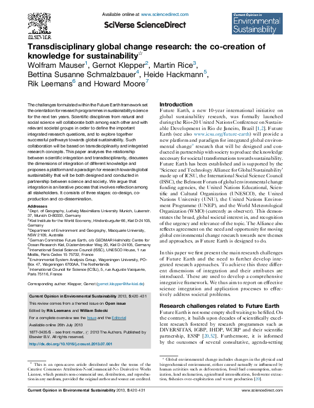 Transdisciplinary global change research: the co-creation of knowledge for sustainability