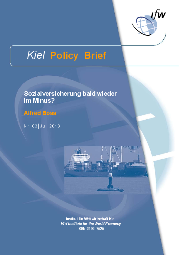 In his Kiel Policy Brief the Kiel economist Alfred Boss warns of the return of the deficit in Germany’s social insurance. The financial situation of the social security system in Germany has improved due to the strong upswing. Facing favorable perspectives for 2013 and 2014, the federal government reduced the transfers to social insurance drastically. The rate of contributions to social security was reduced. As a consequence, the surplus will decline despite of a favourable economic development in 2013 and 2014.