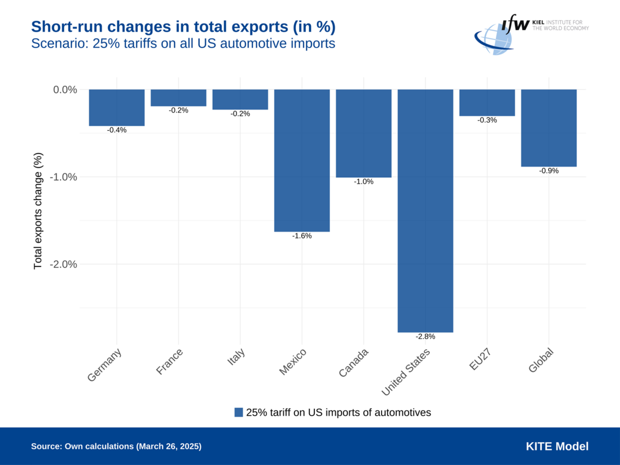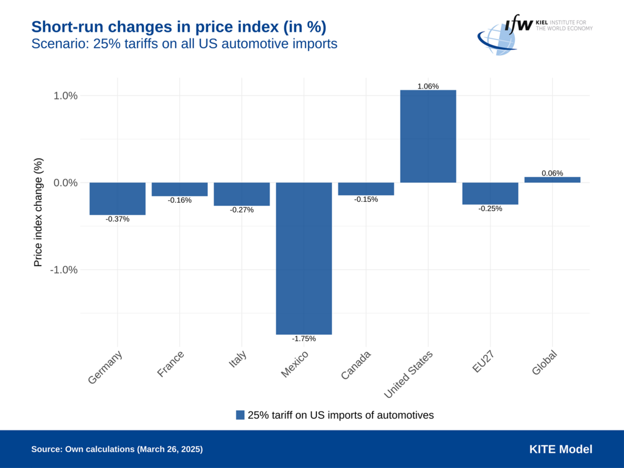 The US administration has just announced an additional 25% tariff on US automotive imports. In the short term (~1 year), Mexico (-1.81% real GDP) and Canada (-0.6%) would be particularly affected. Germany would get off relatively lightly at -0.18%. Overall, export losses will be limited as cars are often produced close to the sales market. Consumer prices in the USA are expected to rise by around one percent. Our analysis assumes no counter-reaction for the time being.